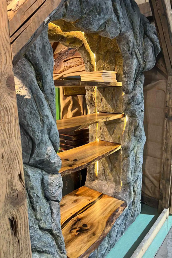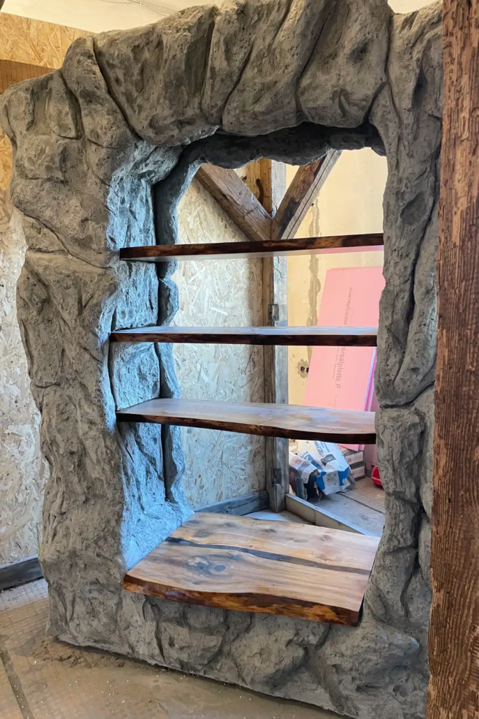 Kálmán kreatív agya gyorsan beindult, ötletekből nem volt hiány. A nehezebb része az volt, hogyan lehet mindezt valóban meg is valósítani, méghozzá egy ideiglenes térben, szűk határidővel. A koncepció végül a fa és a szikladekor kombinációjára épült, ami egyszerre hozza a természetességet, az erőt és az egyediséget — pontosan azt a hangulatot, amit a munkáinkkal is szeretnénk átadni.